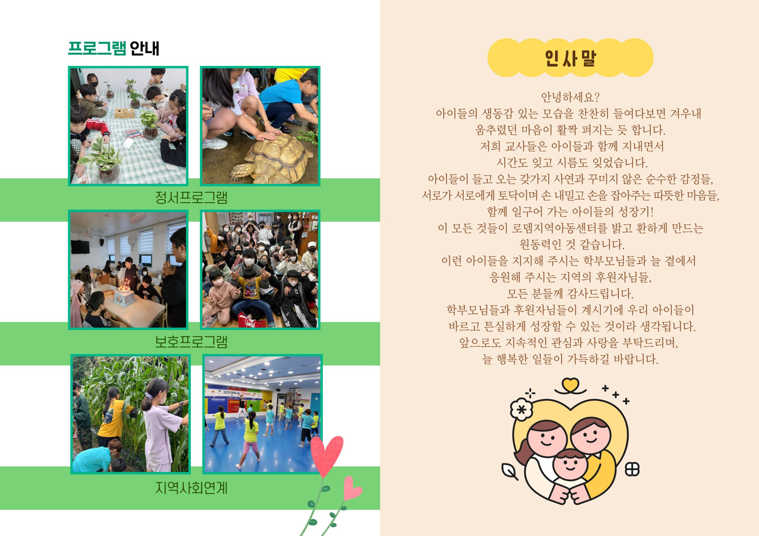 굳이 세상과 발맞춰 갈 필요있나? 우리의 보폭대로 우리 호흡대로 가자! 이렇게 2023년 우리들은 함께 보폭을 맞추고 나의 속도대로 성장하는 한 해였습니다. 자연과 교감하며 힐링하기도하고 나의 신체를 건강하게 몸도 튼튼 마음도 튼튼 움직여 보기도 했습니다. 때론  마술사가 되기도 하고 요리사가 되기도 하며 나름의 성장을 해내는 그런 한 해 였습니다. 아이들의 웃음이 있는 로뎀의 생동감을 소식지에 담아봅니다