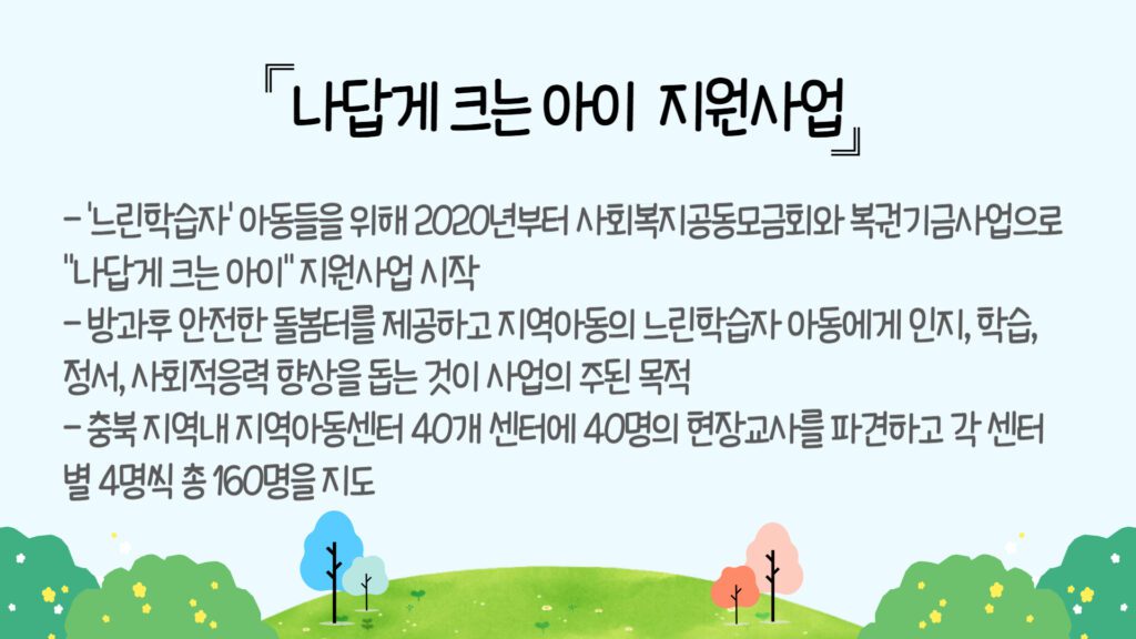 우리가 믿고 기다려준다면, 자신만의 속도에 맞춰 천천히 성장하고 발전 가능성이 높은 아이들입니다. 아이들이 스스로 볼 수 있도록, 발전과정을 시각화하여 격려하면 느리지만 앞으로 나아갈 힘을 얻어서 ‘나답게’ 성장할 수 있는 무한한 가능성을 가진 ‘나답게 크는 아이’로 성장할 수 있습니다.